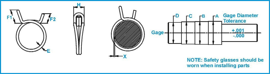 | ROTOR CLAMP DW No. | Remarks | Case Quantity Min. 1 case | Approx. Case Weight (lbs.) | A MAX. Dia. | B NOM. Dia. | C MIN Dia. | D NO-GO GAGE Dia. | E NOM. WIRE Dia. | F1 max. | F2 min. | H OVER-ALL WIDTH | X GAGING WIRE | Color Code * | PNEUMATIC INSTALLATION TOOL | |